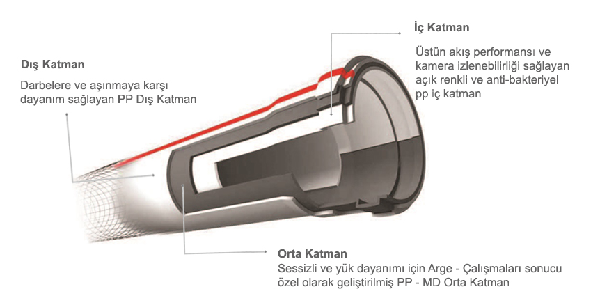 Borunun 3 katmanlı yapısı sessizlik için en ideal tasarımdır. Özel geliştirilmiş yüksek yoğunluklu mineral takviyeli orta katmanı ve İç/dış katmanda kullanılan PP hammadde sayesinde sistemin içindeki sesin sönümlenmesi sağlanır.