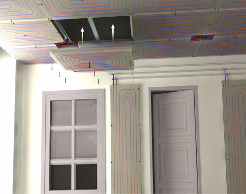 MODULAR COMFORT : Özellikle ofis hastane okul gibi binalarda sıkça kullanılan asma tavan sistemleriyle uyumlu bir şekilde kullanılabilmesi amacıyla tasarlanmıştır. Sistem, kolay montaj yapılabilir metal plaka, yalım malzemesi olarak strafor tabakası (EPS, ya da yüksek ses yalım ihyacı olan mahallerde taş/ kaya yünü) ve 10 mm çapındaki özel tasarlanmış mühendislik polimeri borulardan oluşur.