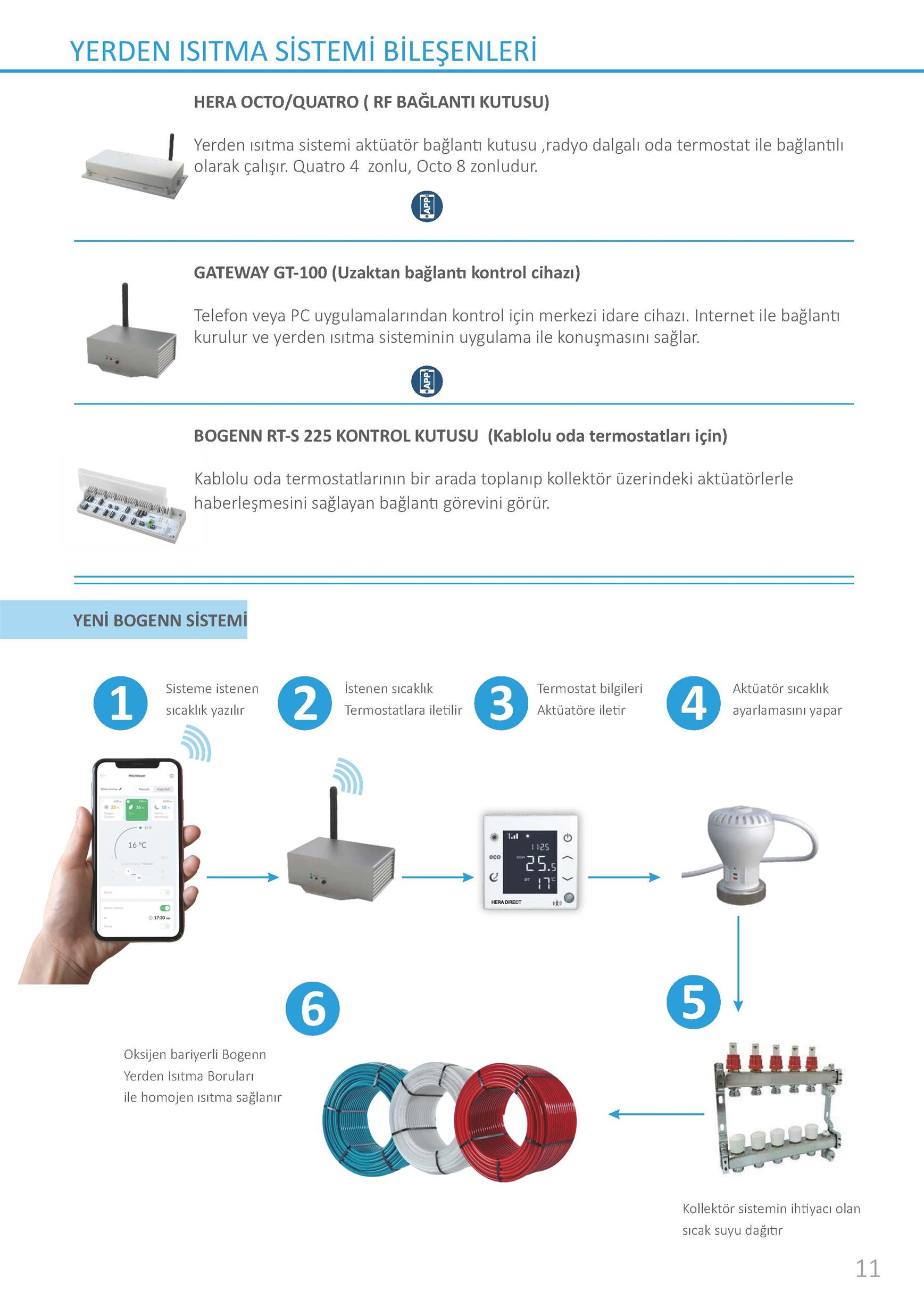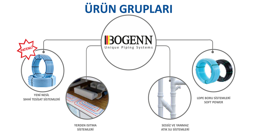 BOGENN oksijen bariyerli PEX-A boruları, pirinç veya paslanmaz çelik kolektörler, izolasyon straforu, kat  ve oda detayına kadar kontrol imkanı sunan akıllı kontrol ekipmanları ile bütün bir yerden ısıtma sistemi sunmaktadır.