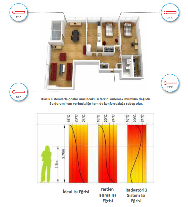 Klasik sistemlerde ısı kayıpları dikkate alınmadan projesiz olarak uygulamalar yapılmaktadır. Yapılan uygulamalarda kullanılan kollektörler debi ayarlı değilse kollektöre yakın odalar daha çok ısınırken uzak konumda yer alan odalarda ısınma problemleri oluşmaktadır. Uzak odayı ısıtabilmek için artırılan sıcaklık nedeniyle yüzey sıcaklığı artarak verimliliğin düşmesine sebep olurken aynı zaman da sağlık problemleri oluşturabilecek sorunlara neden olabilmektedir.